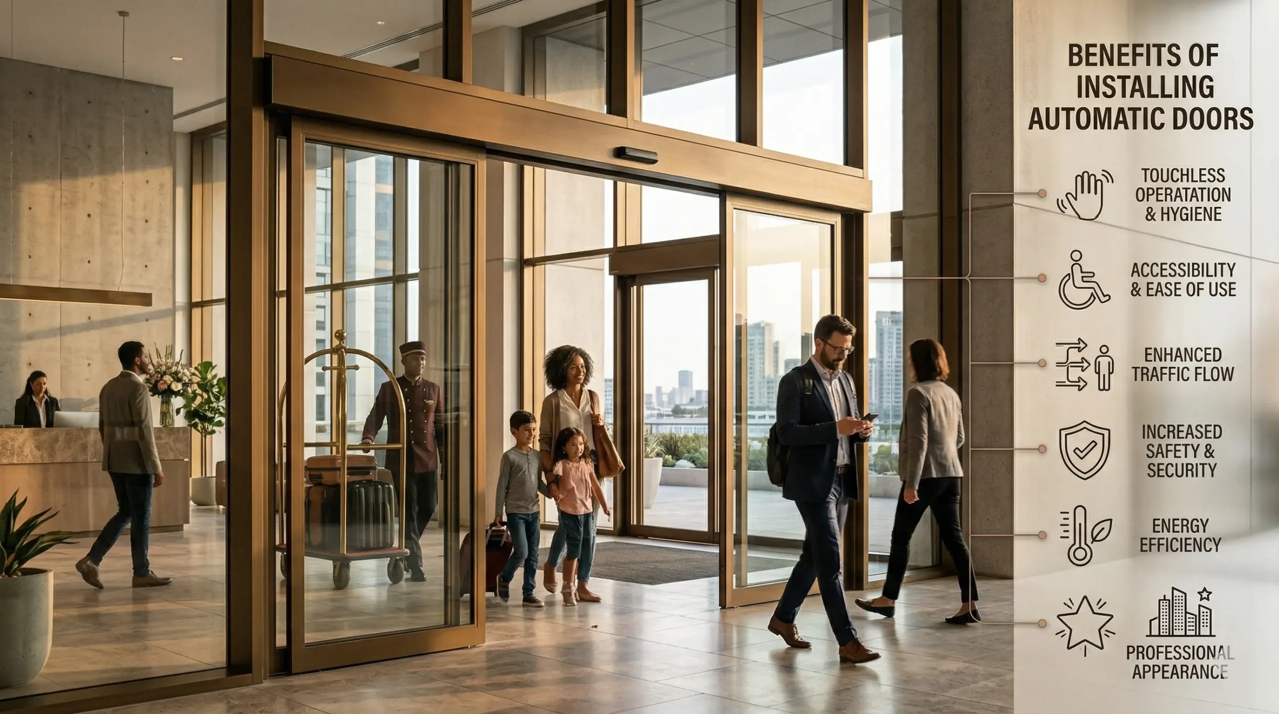 توفر الأبواب الأتوماتيكية سهولة الاستخدام للجميع، بما في ذلك حاملي الأمتعة أو عربات الأطفال أو مستخدمي الكراسي المتحركة. كما أنها مثالية في الحياة اليومية السريعة، حيث تسمح بالمرور دون الحاجة إلى دفع أو سحب باب ثقيل، مما يمنح الزوار شعورًا بالترحيب منذ اللحظة الأولى.